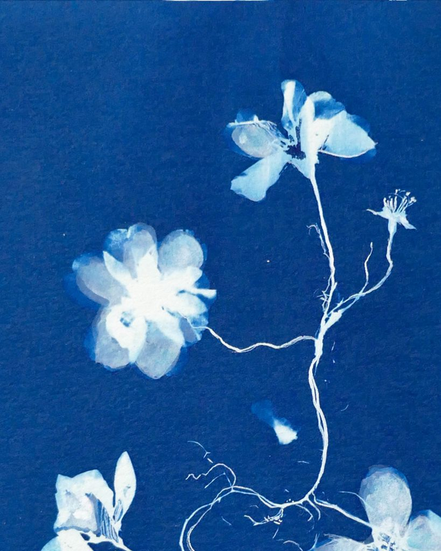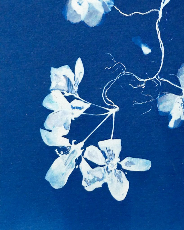 Je crée mes cyanotypes de façon artisanale, et je les retravaille ensuite à l’encre. Chaque modèle est unique et signé. Vous trouverez parfois pour chaque création : des traces de pinceau, des points, des tâches et des traits de plume, ainsi que des variations d’intensité du blanc et du bleu de Prusse. L’œuvre est enfin mise sous presse pour retrouver l’aspect plat du papier.